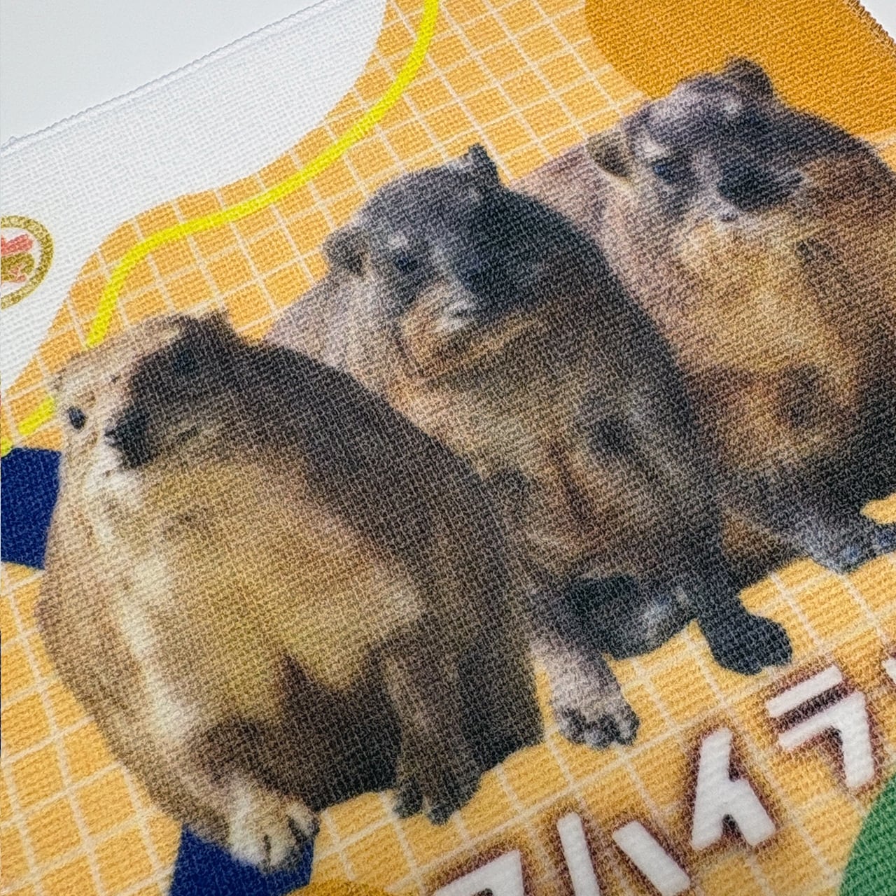 ユニークな魅力たっぷりのケープハイラックス(おやき・どんどん・しおり)をデザインしたミニタオル。